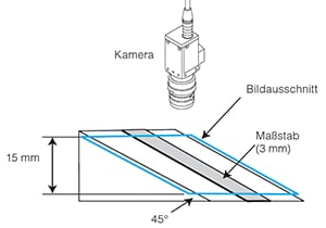 Prüfvorgang: Eine Kamera wird über eine Schräge montiert, wie auf der Abbildung gezeigt. Auf dieser Schräge befindet sich ein Maßstab. Mit Hilfe dieser Vorrichtung lassen sich Bilder zum Vergleichen der Blendenöffnungen erstellen.