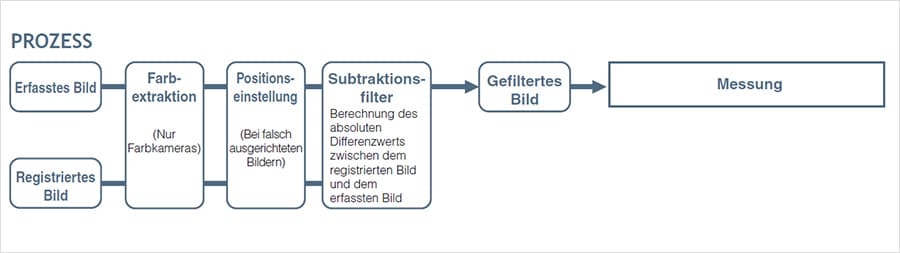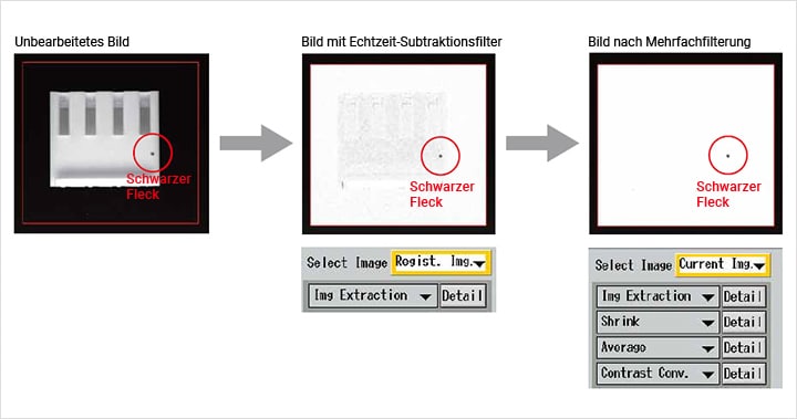 Das Bildverarbeitungssystem CV-3000 kann einen Bereich wiederholt mit zwei oder mehreren Vorbehandlungsfiltern überprüfen. Wenn der Anwender über die Funktionsweise der einzelnen Filter Bescheid weiß, kann damit ein optimales Bild erzeugt werden.