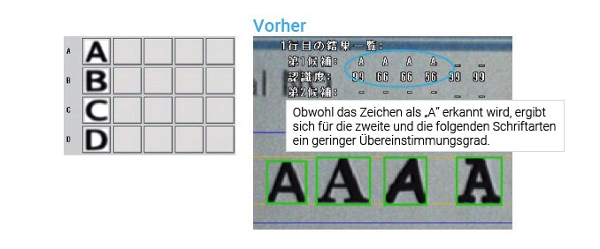 Obwohl das Zeichen als „A“ erkannt wird, ergibt sich für die zweite und die folgenden Schriftarten ein geringerer Übereinstimmungsgrad.