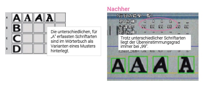 Die Stabilität der Erkennung lässt sich erhöhen, indem für ein Zeichen mehrere Vergleichsmuster hinterlegt werden. Durch die Eingabe unterschiedlicher Schriftarten als mögliche Varianten kann verhindert werden, dass Zeichen aufgrund verschiedener Schriftarten nicht erkannt werden.