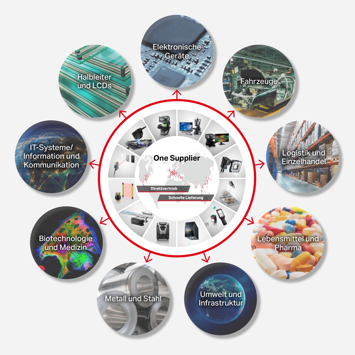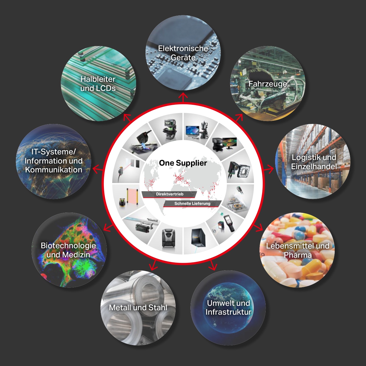 KEYENCE-Produkte erfüllen nicht nur die derzeitigen, sondern auch die zukünftigen hohen Anforderungen unserer Kunden. Sie sind so konzipiert, dass sie in jedem beliebigen Industriebereich und bei unterschiedlichsten Anwendungen weltweit eingesetzt werden können. Mit unseren Vorschlägen für die optimale Produktanwendung in Ihrer Branche - ob es sich nun um die Automobilindustrie, Halbleiter, LCDs, elektronische Geräte, IT-Ausrüstung, Information und Telekommunikation, Stahl und andere Metalle, Lebensmittelindustrie, Medizintechnik oder Logistik handelt - haben wir ein Geschäftsumfeld geschaffen, das nicht an die Trends bestimmter Branchen oder Kunden gebunden ist. Bereits mehr als 300.000 Unternehmen weltweit setzen Produkte von KEYENCE ein.