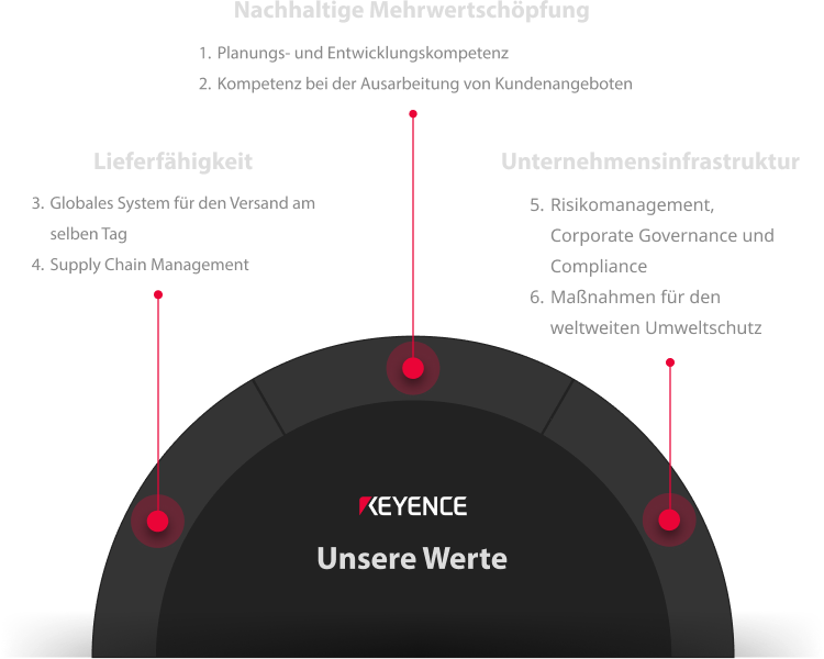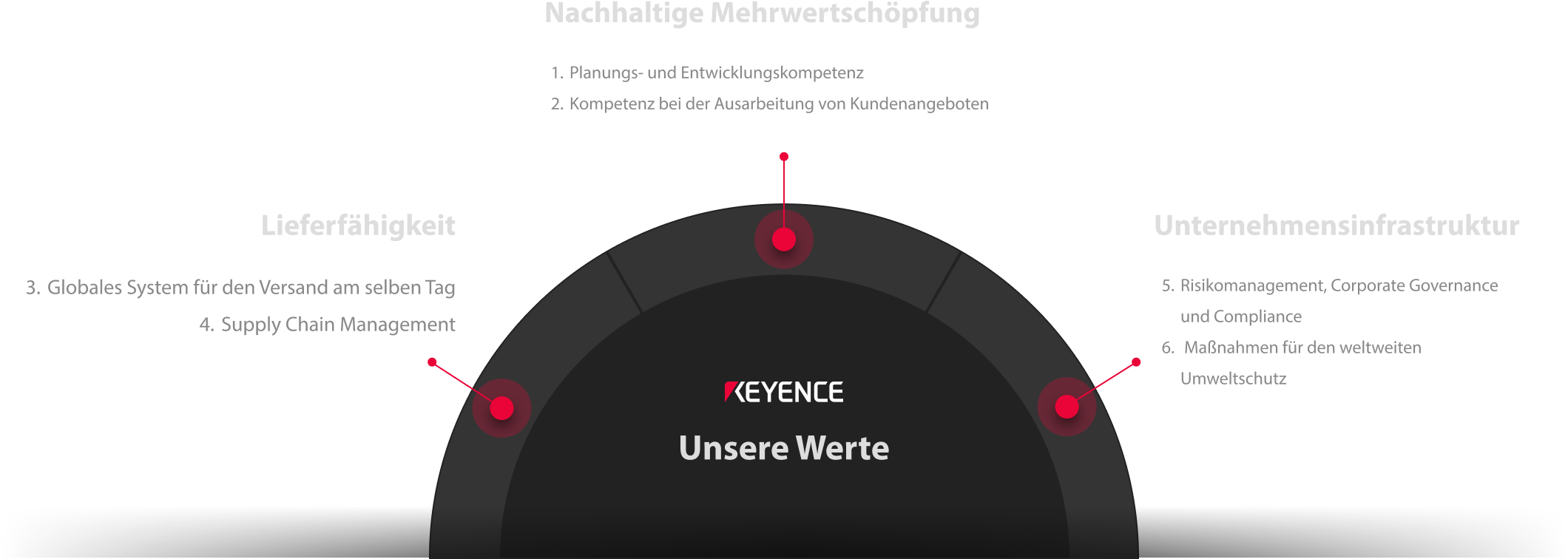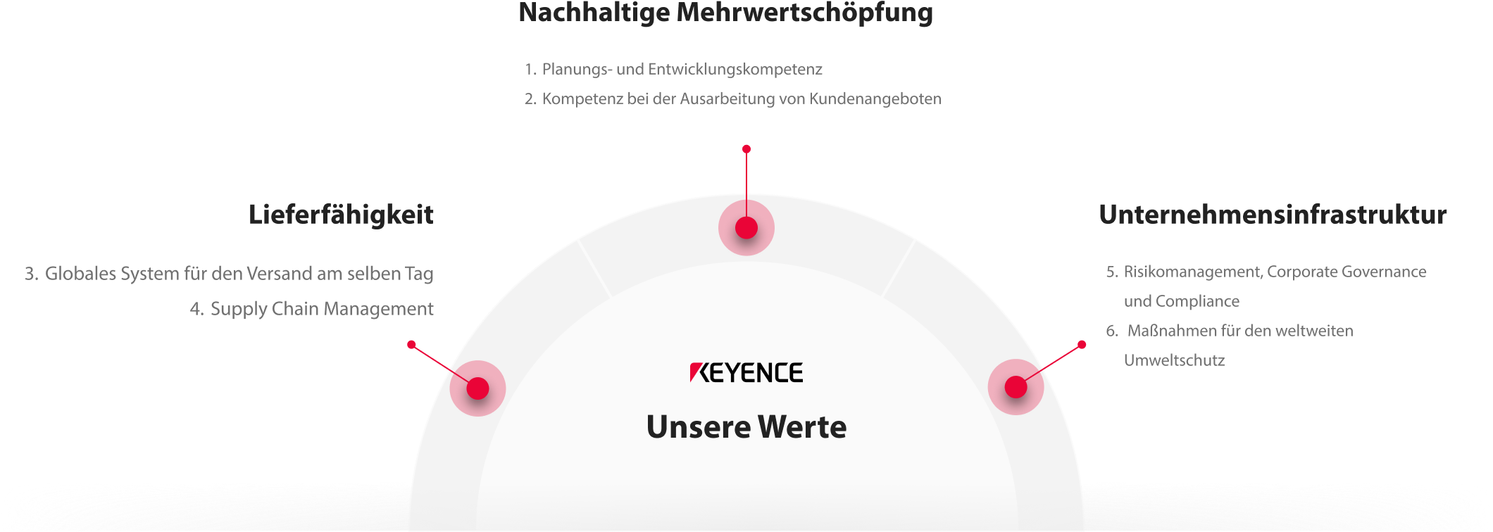 Seit der Gründung von KEYENCE ist die Sicherung des dauerhaften Überlebens des Unternehmens eine zentrale Managementphilosophie. Um ein dauerhaftes Überleben sichern zu können, sollte ein Unternehmen sowohl einen Beitrag zur Gesellschaft leisten, als auch von ihr unterstützt werden. Unser Ziel ist es mit unseren Produkten zur Lösung verschiedenster Herausforderungen im produzierenden Gewerbe beizutragen. Die kontinuierliche Schaffung neuer Werte ist unser sozialer Beitrag, der unserer Meinung nach zu einer nachhaltigen Wertschöpfung führen wird.