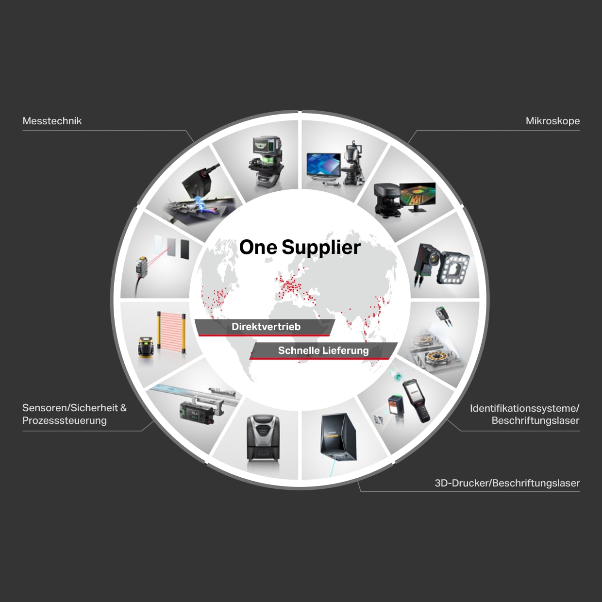 KEYENCE plant und entwickelt Produkte, die für die Fertigung unverzichtbar sind, und bietet einen Direktvertrieb mit optimalen Lösungen für jedes Kundenanliegen. Unsere Produktpalette umfasst eine Vielzahl von Sensoren für die Automatisierungstechnik, wie z.B. Universalsensoren und Wegmesssensoren, Messsysteme, SPS, Barcodeleser, Beschriftungslaser, Digitalmikroskope und 3D-Drucker. Dass wir als einziger Anbieter in der Lage sind, eine Vielzahl von Problemstellungen zu lösen, ist einer der Hauptgründe dafür, dass KEYENCE für viele Hersteller die erste Wahl ist.