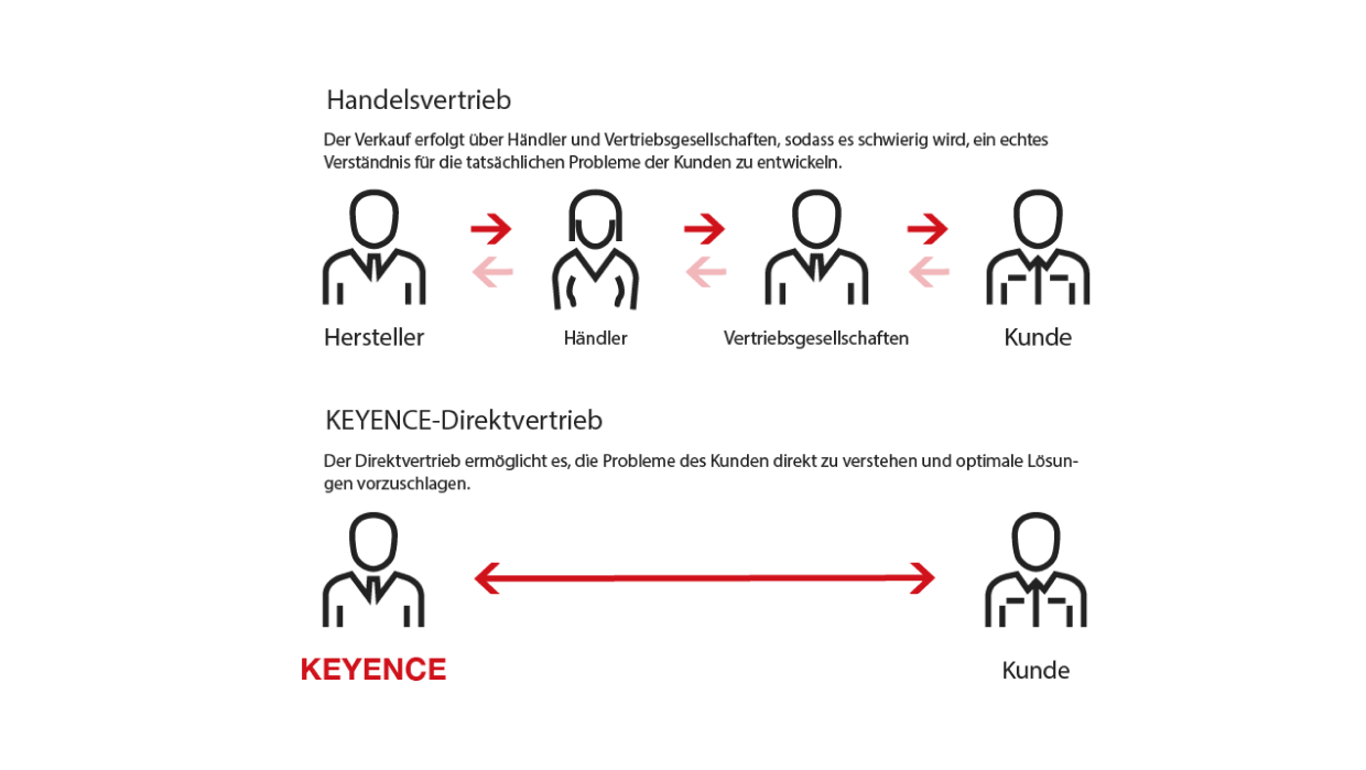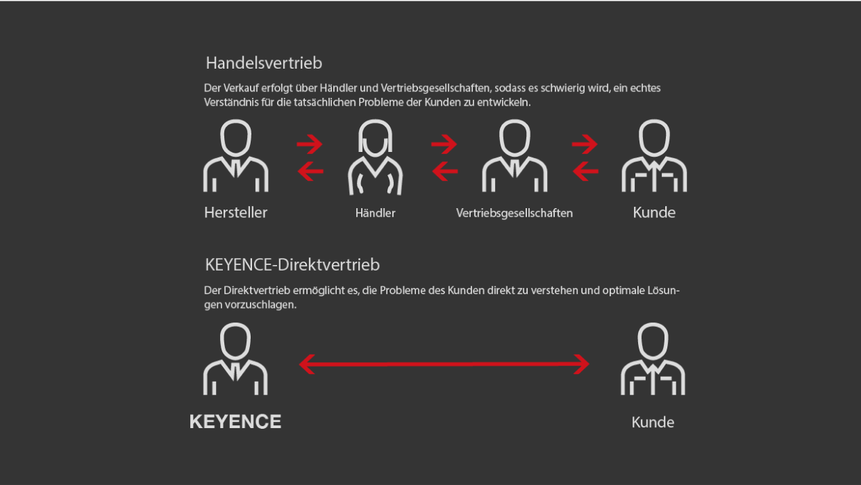 Bei KEYENCE sehen wir die Steigerung unserer Verkaufsquote außerhalb Japans als eine unserer geschäftlichen Herausforderungen. Unser derzeitiger Anteil am Auslandsumsatz entspricht noch nicht unserem tatsächlichen Potenzial. Wir sind überzeugt, dass unser Direktvertriebsmodell auf internationalen Märkten, in denen es ein erhebliches Wachstumspotenzial gibt, das Potenzial hat, sich durchzusetzen und zu einer erheblichen Umsatzsteigerung führt.