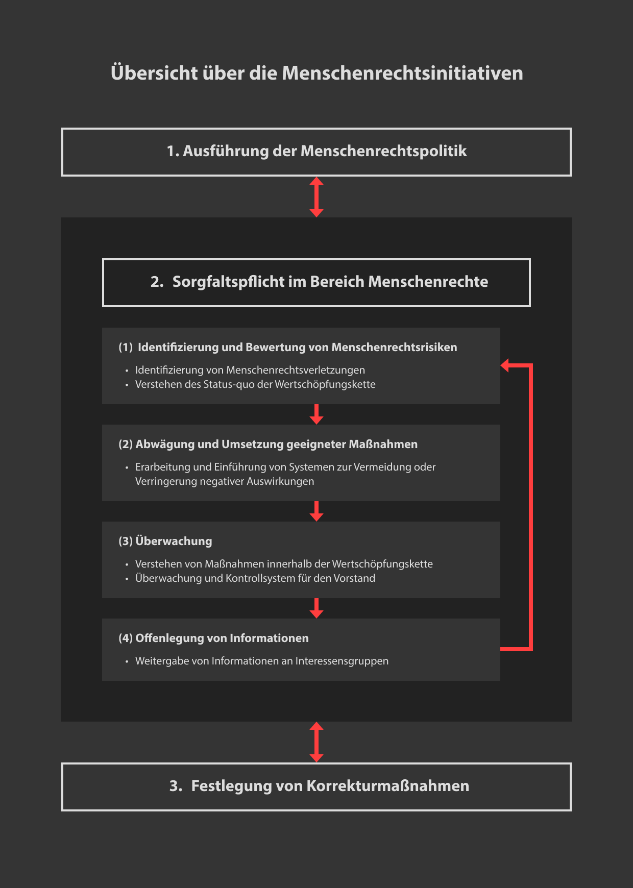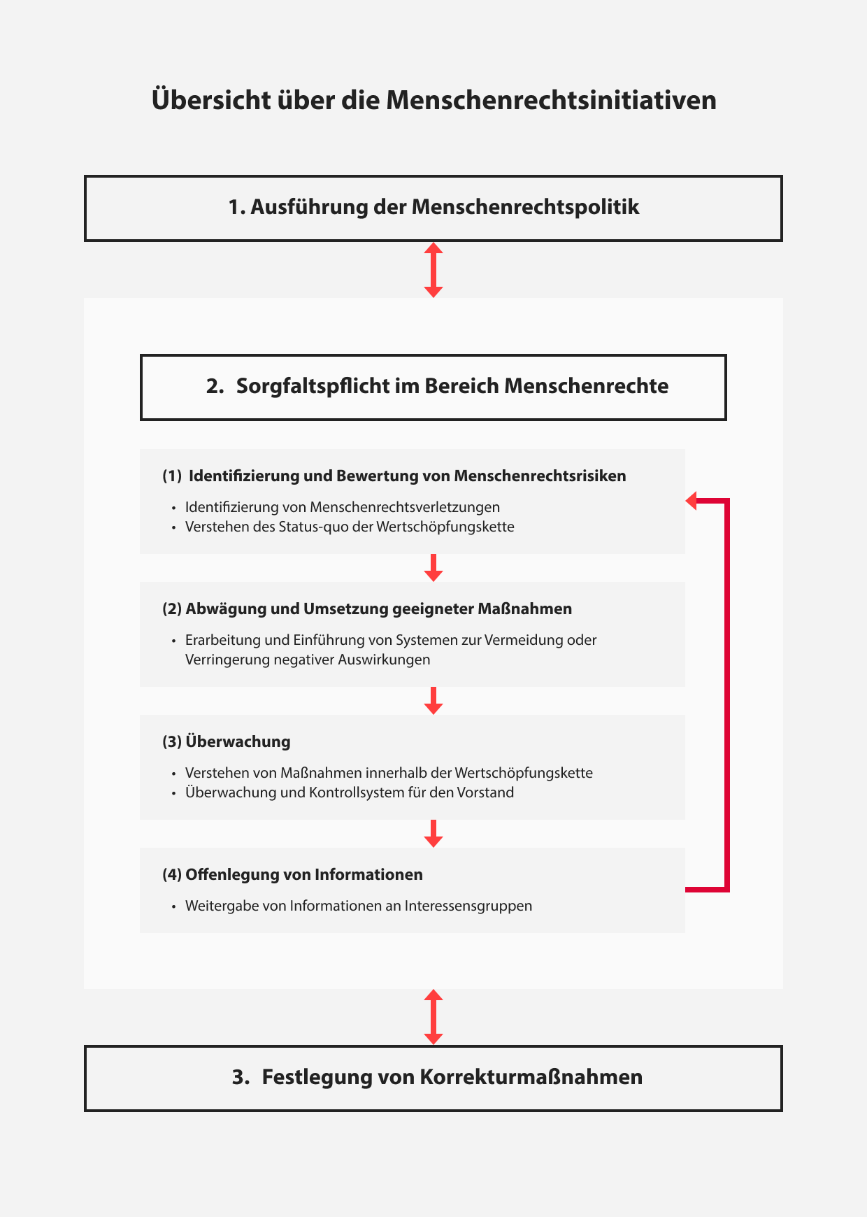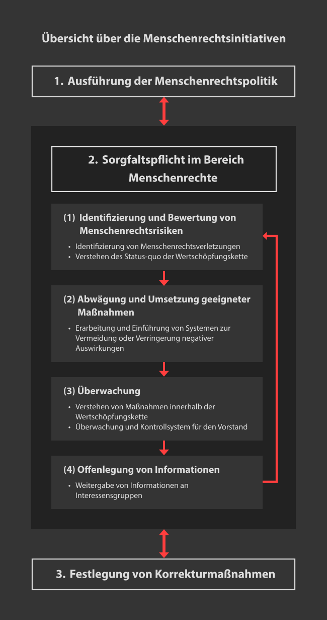 Die Abteilung Corporate Planning & Coordination unter der Leitung ihres für Nachhaltigkeit zuständigen General Manager fungiert als zentrale Abteilung für Initiativen zur Vermeidung und Verringerung einer Gefährdung von Menschenrechten. Diese Abteilung arbeitet bei der Umsetzung dieser Initiativen mit verschiedenen Abteilungen wie der Personalabteilung, der Rechtsabteilung, dem Materialwesen und dem Produktionsmanagement zusammen. Zu den wichtigsten Aktivitäten gehören: (1) Formulieren und Überprüfen der Menschenrechtspolitik, (2) Erkennen und Bewerten einer Gefährdung von Menschenrechten, (3) Erarbeiten und Umsetzen von geeigneten Maßnahmen, (4) Überwachungsaufgaben und (5) Offenlegen von Informationen sowie Fördern der Lieferanteneinbindung. Bei Bedarf holen wir als Referenz auch bei externen Fachleuten Rat ein.